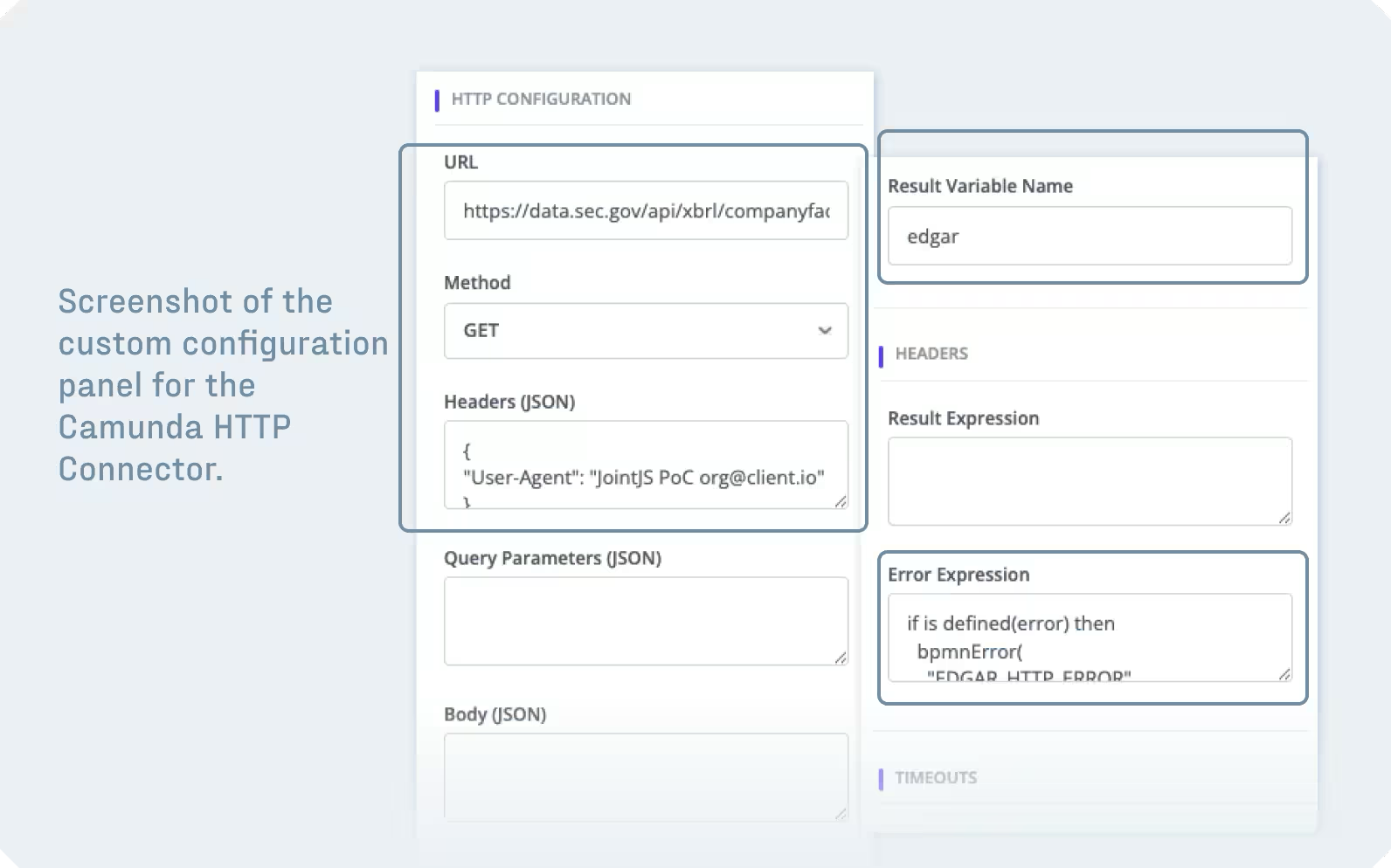 Property panels are the area where much of the BPMN-specific interaction complexity is concentrated. The BPMN specification defines a broad array of configurable attributes for each element type, and engine-specific namespaces add even more on top of that (plus whole extension elements). For example, a fully specified HTTP connector task in Camunda 8 requires fields for URL, HTTP method, request headers, request body, connection timeout, read timeout, result variable, result expression, error expression, retry count, retry backoff, and I/O mappings. Presenting these in a way that is understandable to the target user audience – especially when those users may not be developers – is a significant design challenge. Grouping, ordering, conditional visibility, inline validation, and contextual help all shape how your modeling UI will be received by your users.