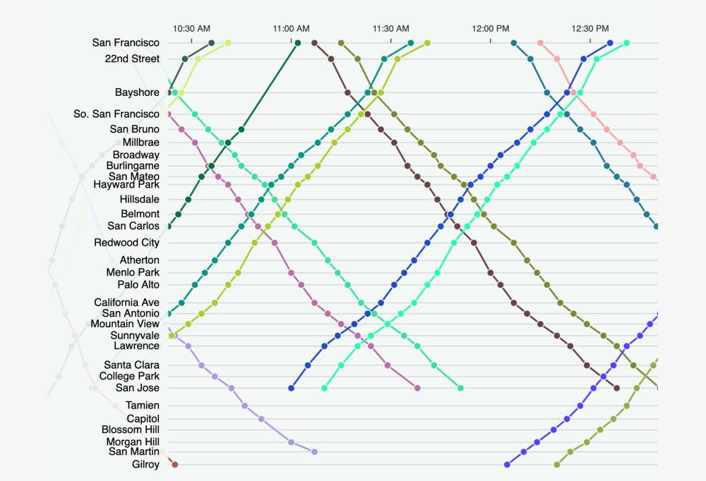 Timetable display is one of the use cases for which a Marey diagram can be used. Another application is workflow analysis, which helps companies to clarify, for example, the efficiency of their teams. In an interesting example explained in this article, we see a comparison of four teams trying to achieve the same result. In this case, displaying the workflow in the Marey chart gives supervisors a good idea about how quickly each of the teams managed to build and deploy a solution.